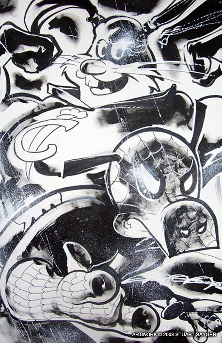 3 stages of creation of the cover to Bionicle Ignition #5. Stage 1 is graphite. Stage 2 in ink with Gouache, and digital toning. Stage 3 is the final art showing Alex Blayeart's digital coloring over the black and white art from stage 2.